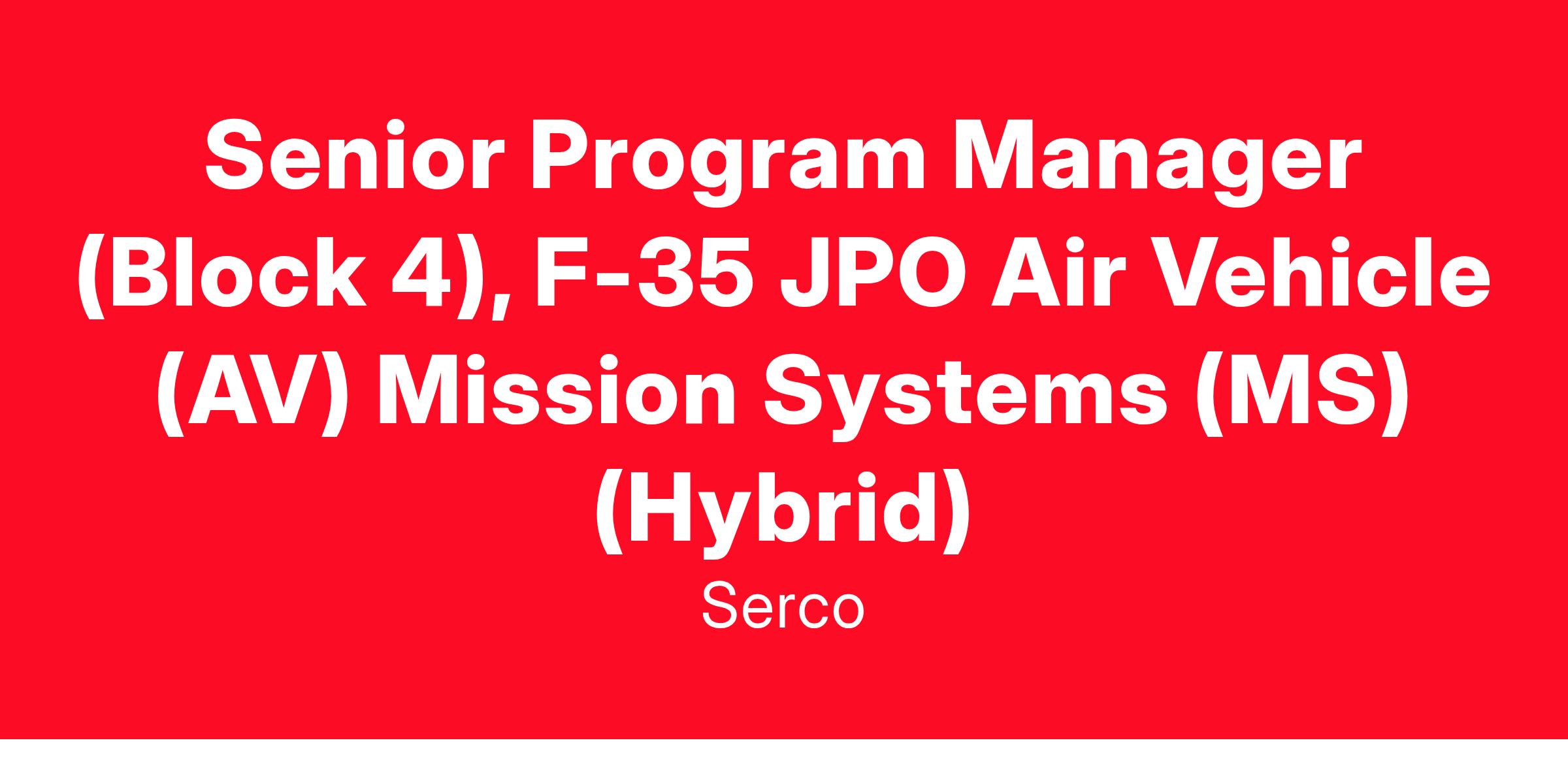 Our Senior Program Manager (Block 4), located in Crystal City, Arlington, VA, provides senior-level program management support to the F-35 Air Vehicle (AV) Mission Systems (MS) Program Management Office (PMO) and directly supports the the AV MS PMO Block 4 ACAT 1D Sub Program within the overall F-35 ACAT 1D Program.